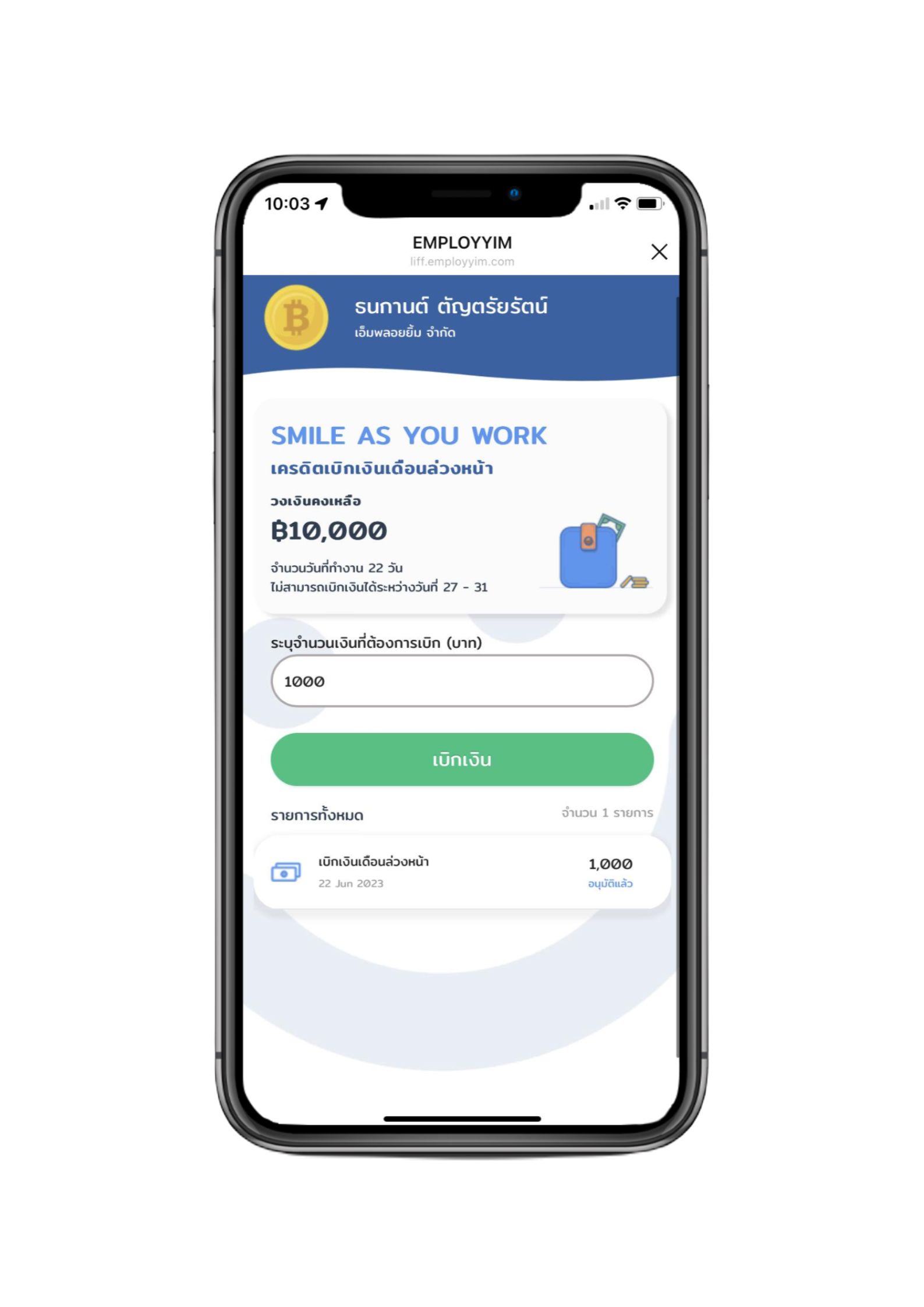 เทคโนโลยีทางการเงินสำหรับองค์กรเพือช่วยเหลือและแก้ปัญหาทางด้านการเงินให้กับพนักงานในองค์กรของคุณ โดยมีเป้าหมายหลักในการให้บริการเบิกเงินเดือนล่วงหน้า แอปพลิเคชันที่จะช่วยให้พนักงานเลือกรับเงินเดือนได้ทันทีโดยไม่ต้องรอสิ้นเดือน